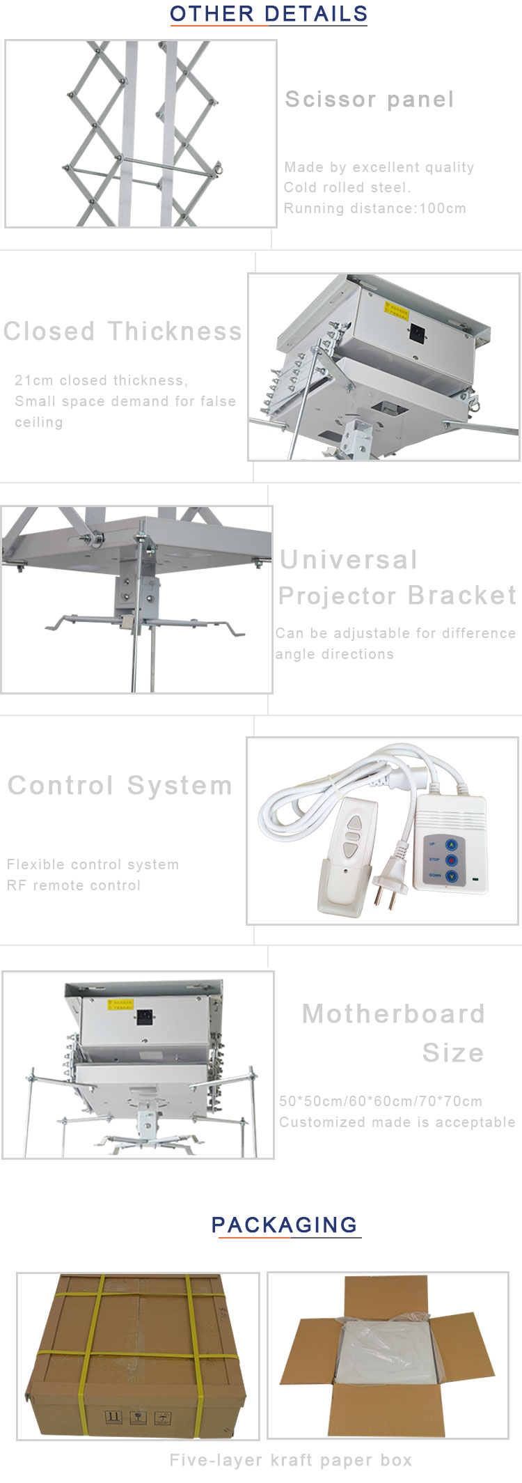 Projector lifts are widely used in multi-functional conference rooms, multi-purpose hall, and international conference center, training center, academic Hall, classrooms and electricity in the field of intelligent home.