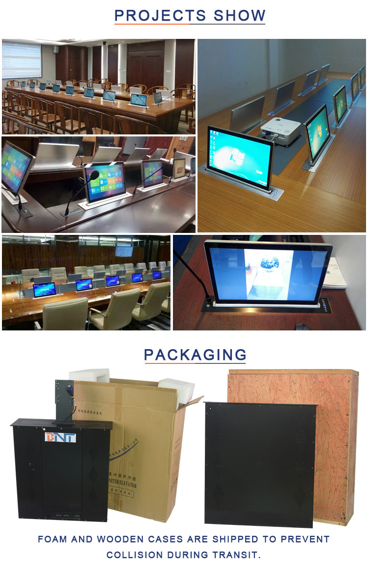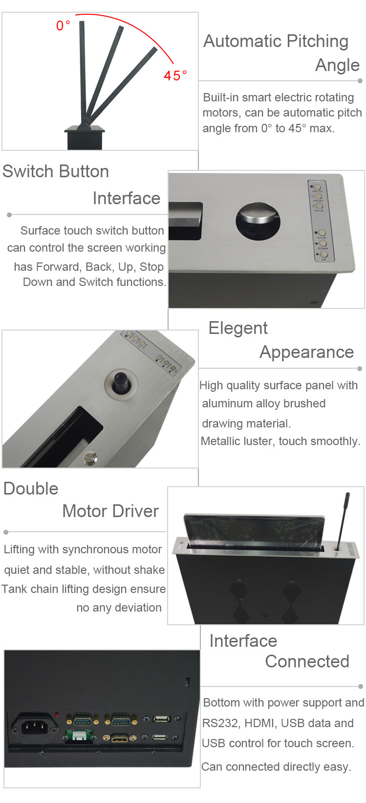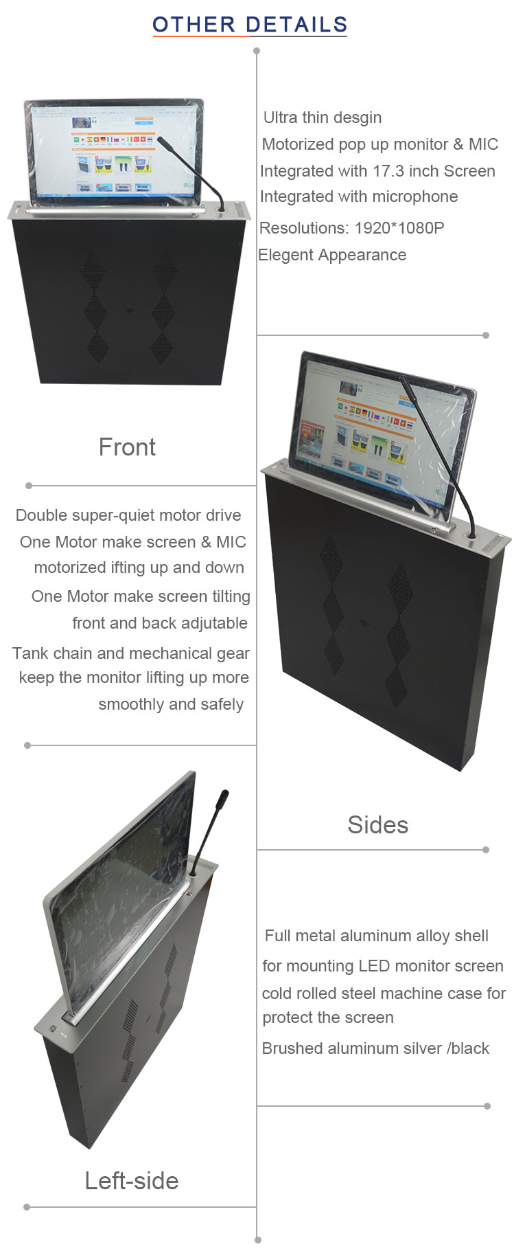 超薄液晶屏升降器设计为音频视频系统的先进隐藏设备。带有15.6,17.3,18.5,21.5英寸全高清触屏液晶屏可供选择,以满足对不同显示器尺寸的要求。