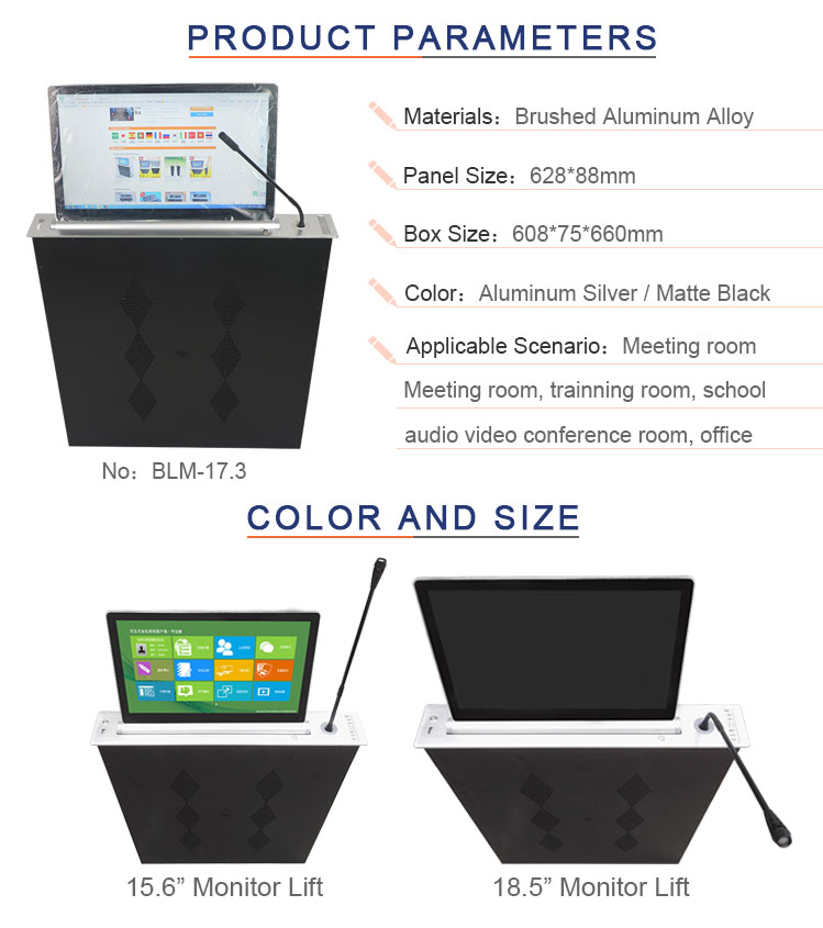 BLM-17.3被设计为超薄显示器升降器的先进集成隐藏设, 备带17.3英寸屏幕+电动升降麦克风,用于会议音频视频系统。