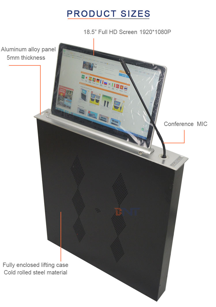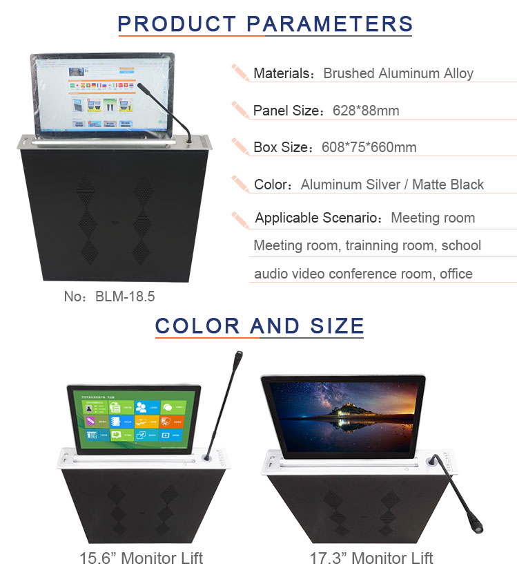 BLM-18.5被设计为超薄显示器升降器的先进集成隐藏设, 备带18.5英寸屏幕+电动升降麦克风,用于会议音频视频系统。