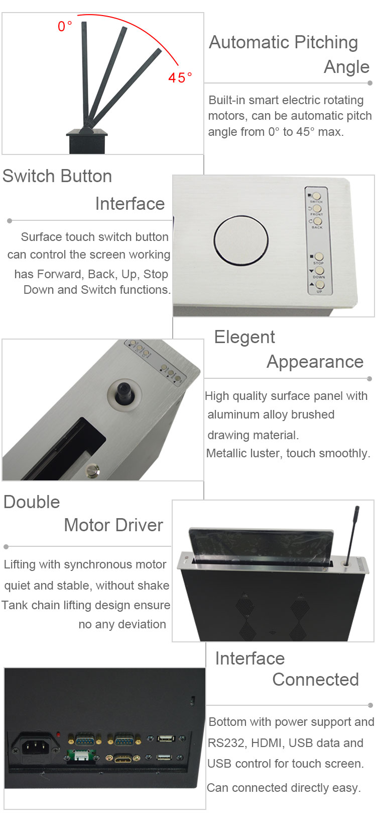 超薄液晶屏升降器设计为音频视频系统的先进隐藏设备。带有15.6,17.3,18.5,21.5英寸全高清触屏液晶屏可供选择,以满足对不同显示器尺寸的要求。