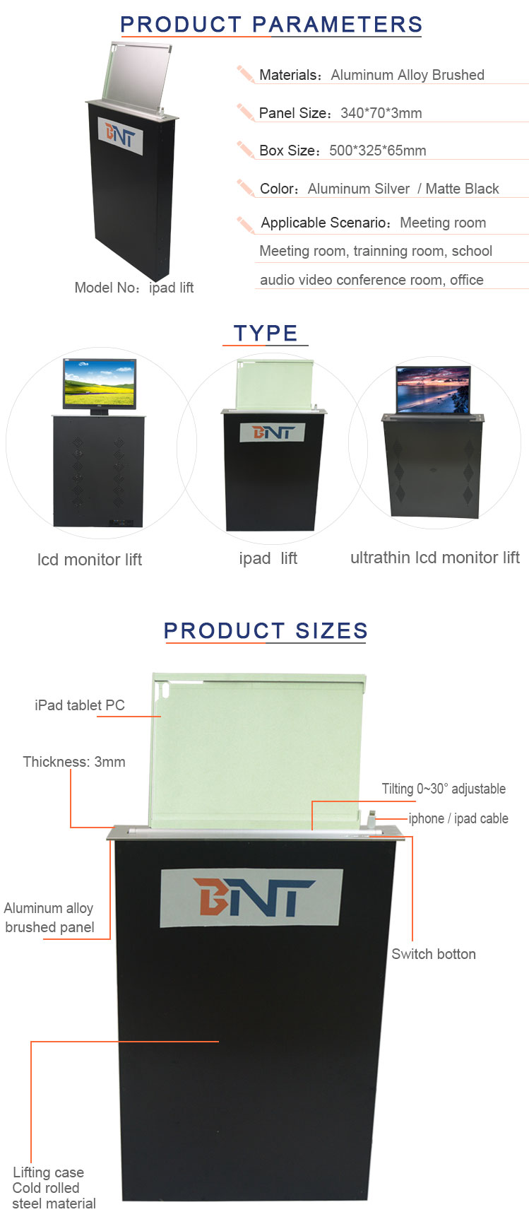 平板电脑电动升降器是为办公家具中的音频视频系统设计的高级隐藏设备。不用时,电动监视器升降机的液晶屏将向下升入办公桌,并隐藏在办公室桌子下面;计算机触摸屏升降器内的屏幕将通过触摸开关或遥控器从桌面自动升起,并在桌面上显示可用的屏幕(如果使用)。