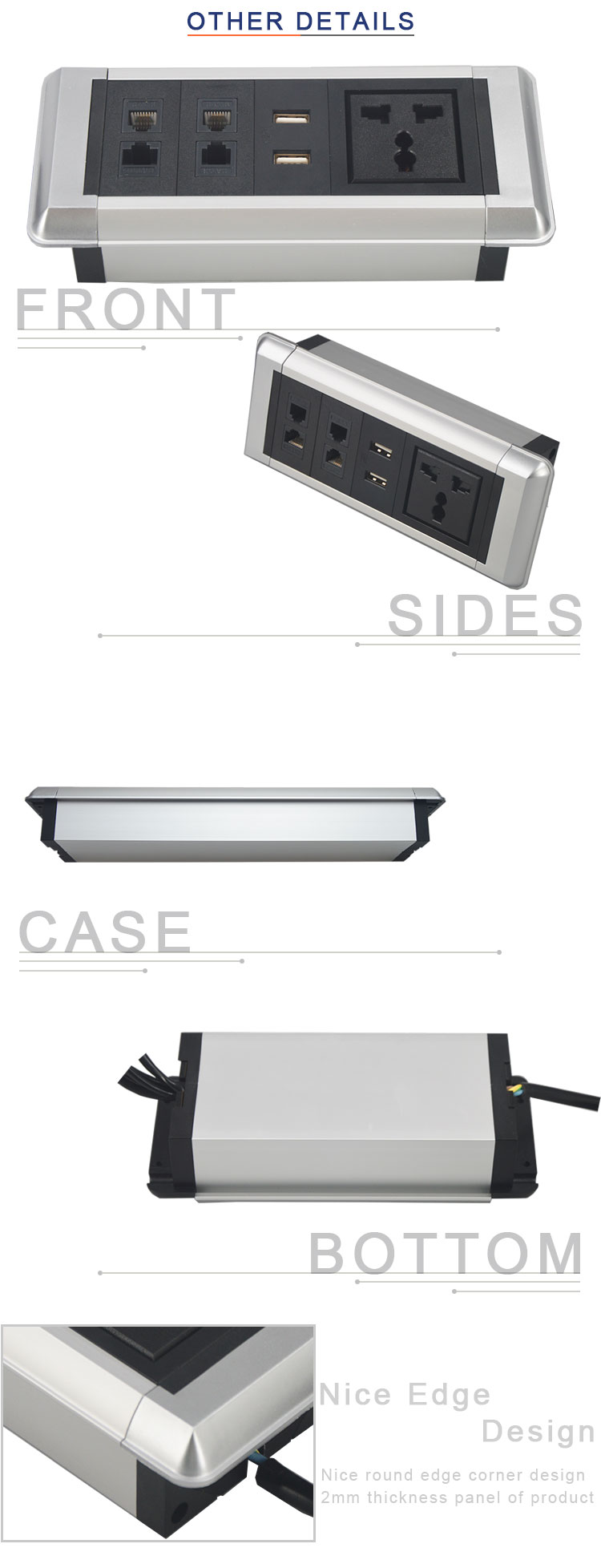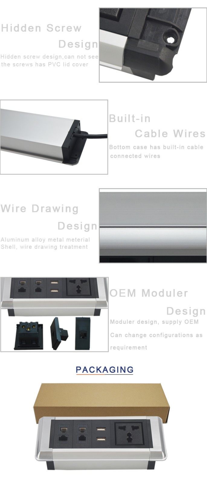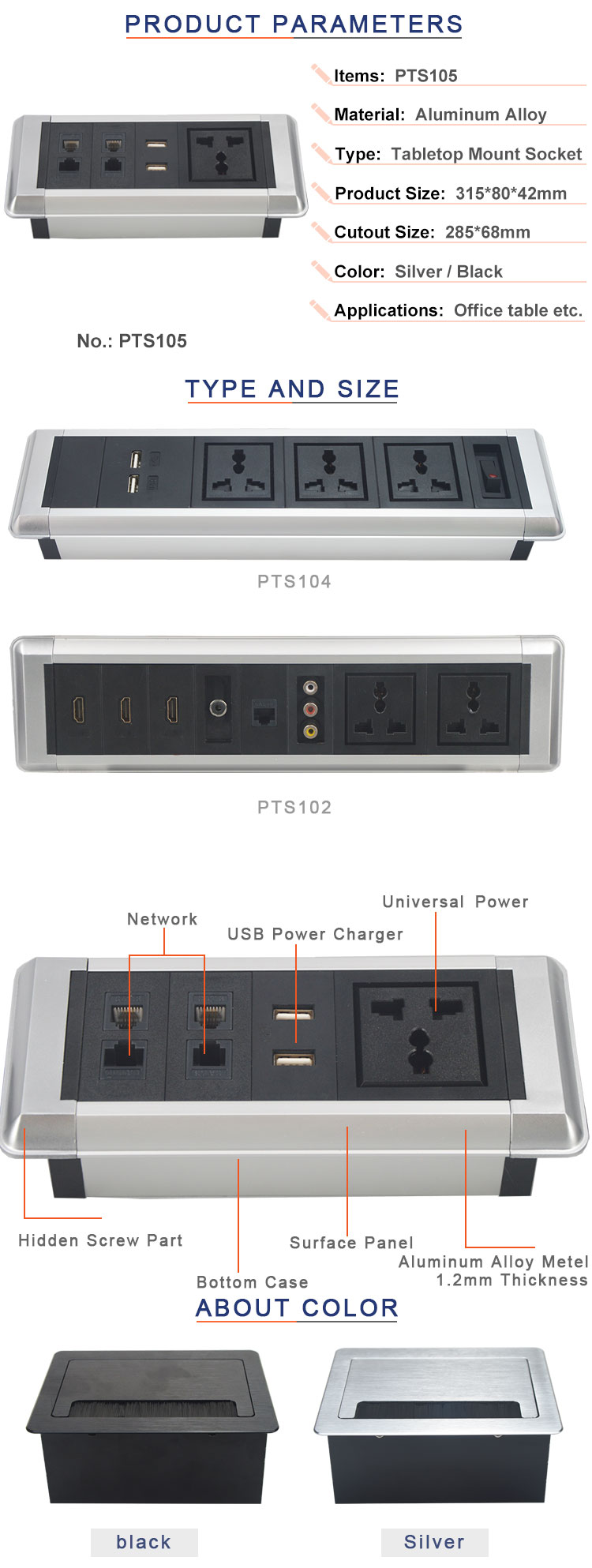 PTS系列台式插座是一种悬挂式电源插座,采用铝合金材料设计,不易生锈,经久耐用。可提供通用电源插座,可适应各种电源插头或其他标准电源插座。