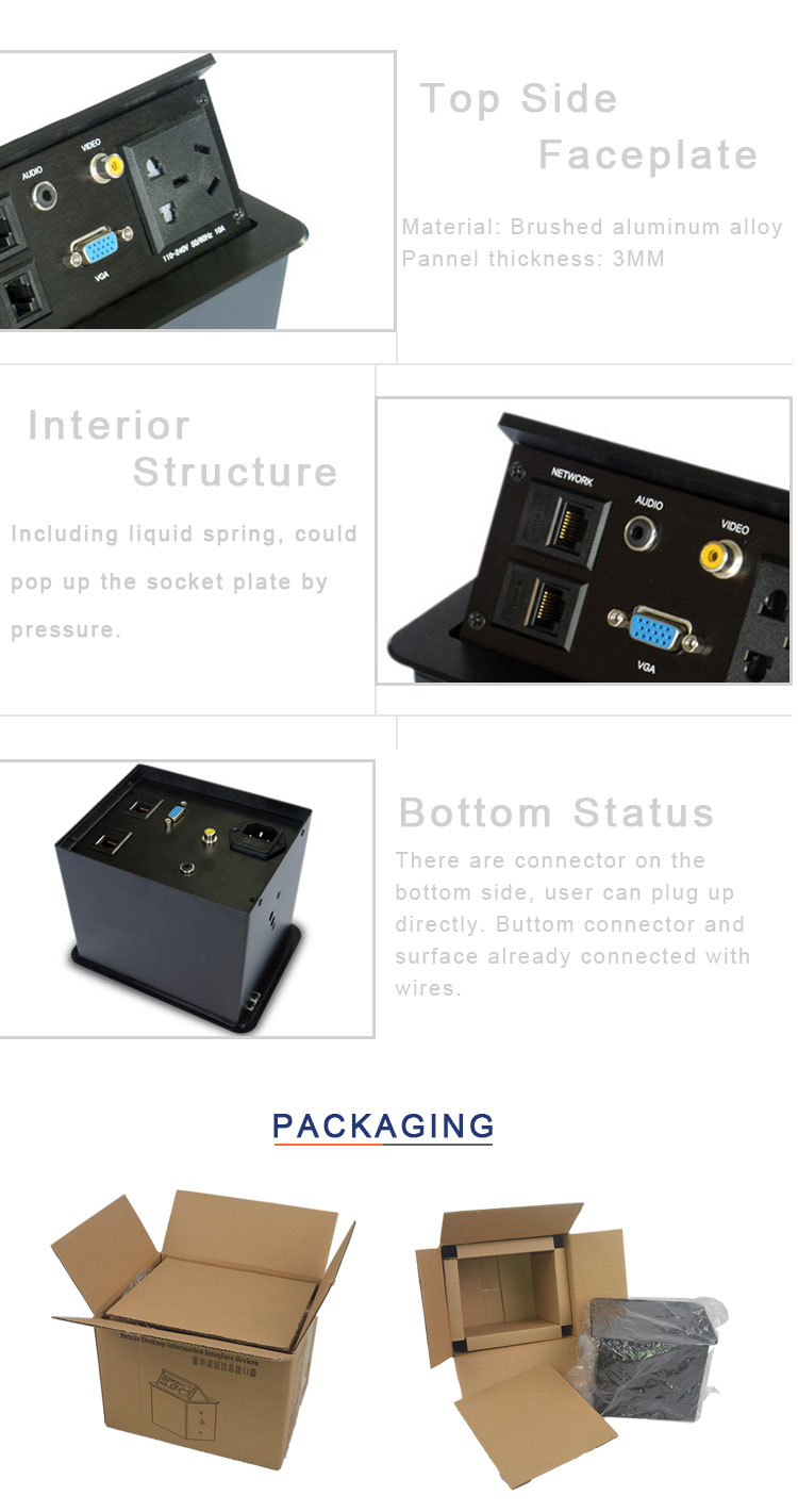 它广泛用于办公家具,高层办公桌,会议室桌面AV解决方案,多媒体教室,酒店房间和培训室等。