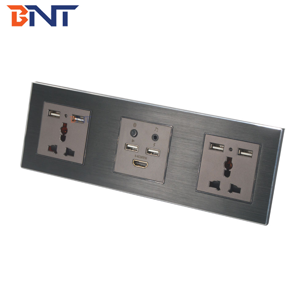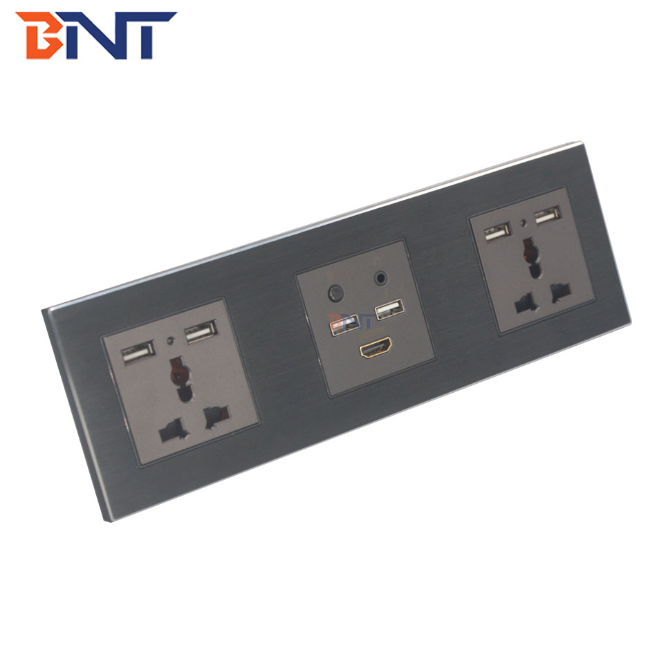铝合金墙壁插座板广泛用于办公和酒店家具,高级办公室,豪华会议桌,酒店和多媒体教室和培训室。