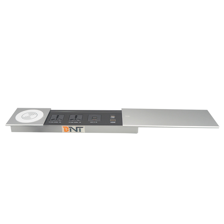 BC-01桌面插座设计为具有多功能配置的现代滑盖插座,它是一种隐藏的设备,因为它安装在桌面上使用并在不使用时隐藏在桌子中。使用无线充电器连接器,用户可以将手机放在充电器上,无需电线直接充电。根据您的选择,它还有USB充电器连接器,可通过USB线为移动设备或其他设备充电。