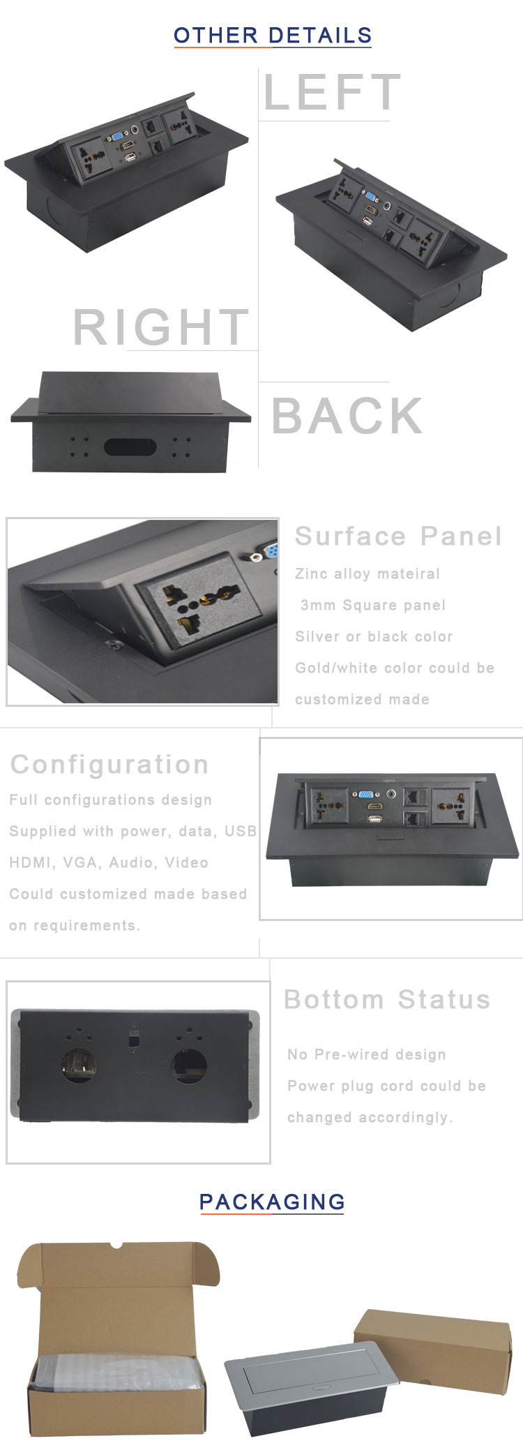 这个插座通常安装在工作台和所有连接器上并隐藏在表面锌合金面板下面。 可以节省更多空间并保持表格整合和符合要求。 为办公室和会议室提供时尚和现代化的环境。