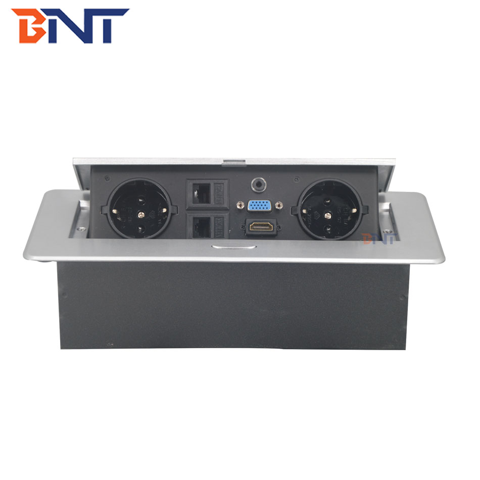 这个插座通常安装在工作台和所有连接器上并隐藏在表面锌合金面板下面。 可以节省更多空间并保持表格整合和符合要求。 为办公室和会议室提供时尚和现代化的环境。