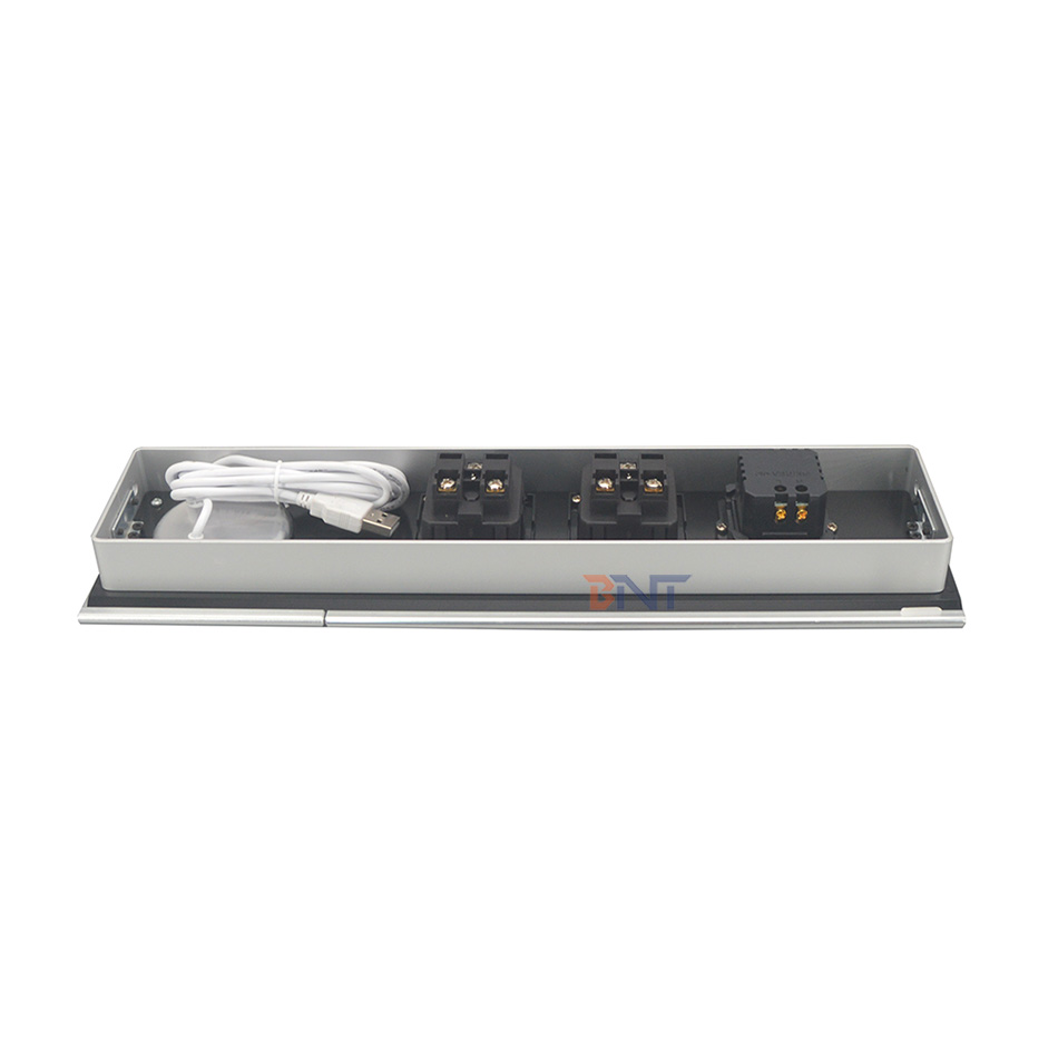 BC-0405桌面插座设计为具有多功能配置的现代滑盖插座,它是一种隐藏的设备,因为它安装在桌面上使用并在不使用时隐藏在桌子中。有USB充电器连接器,可通过USB线为移动设备或其他设备充电。