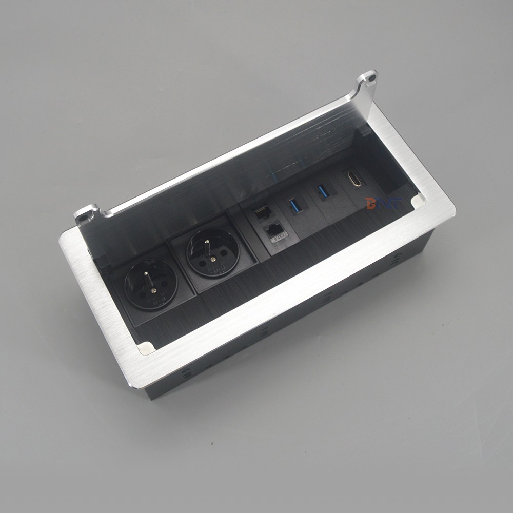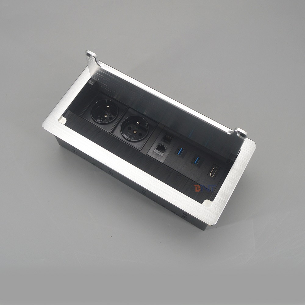 桌面插座的拉丝盖由铝合金材质加工制成,可以打开和翻盖关闭。