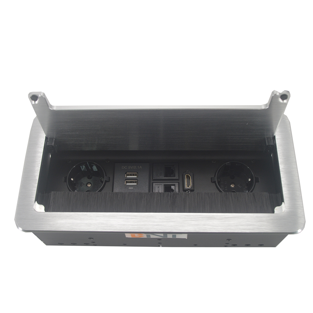 桌面插座的拉丝盖由铝合金精加工制成,可以打开和翻盖关闭。并且所有插座都可以通过刷盖轻松使用而无需打开盖子。