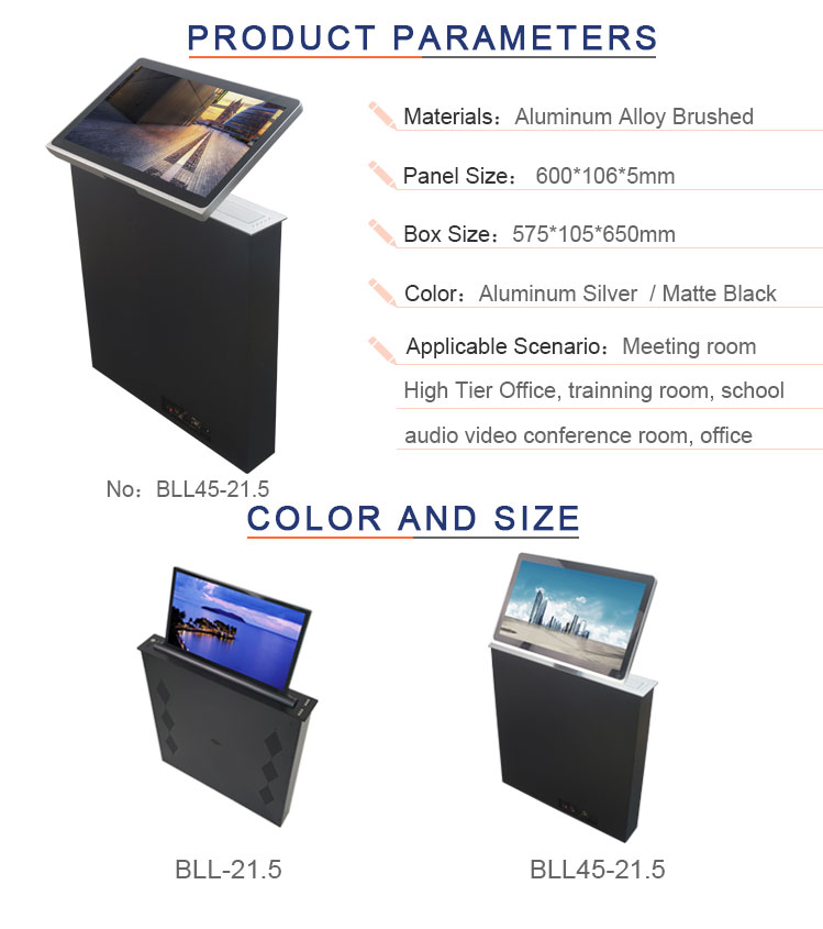 液晶电动升降器性能稳定,自动运行,节省空间。凭借其智能功能,它可以为会议提供有效的方式,愉快的会议沟通和信息展示的体验。