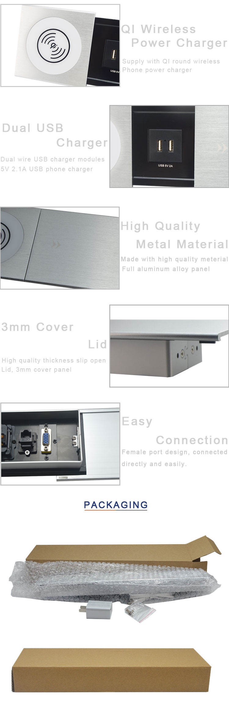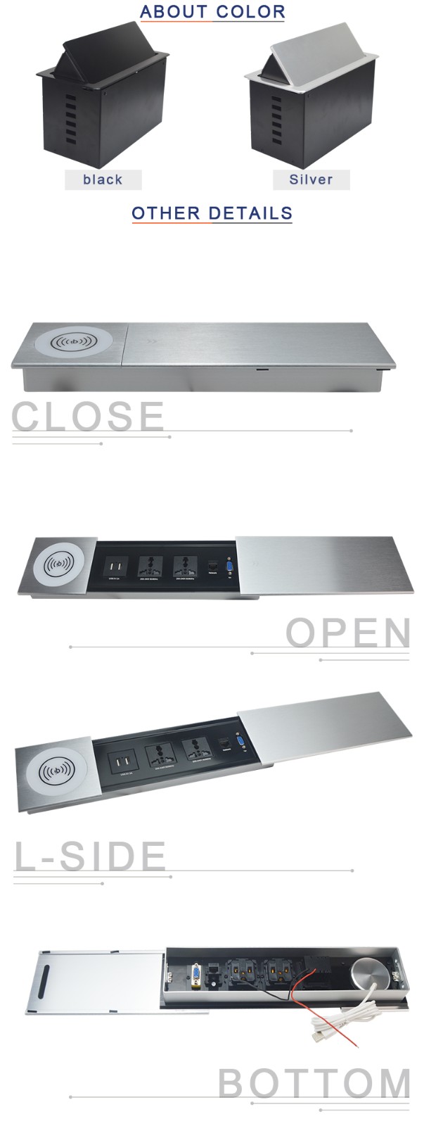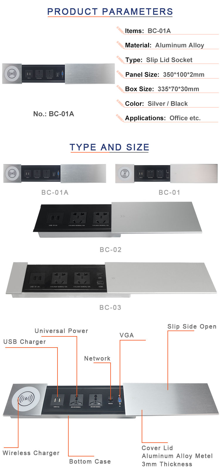 BC-01桌面插座设计为具有多功能配置的现代滑盖插座,它是一种隐藏的设备,因为它安装在桌面上使用并在不使用时隐藏在桌子中。使用无线充电器连接器,用户可以将手机放在充电器上,无需电线直接充电。根据您的选择,它还有USB充电器连接器,可通过USB线为移动设备或其他设备充电。