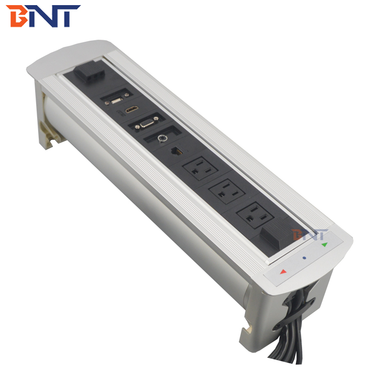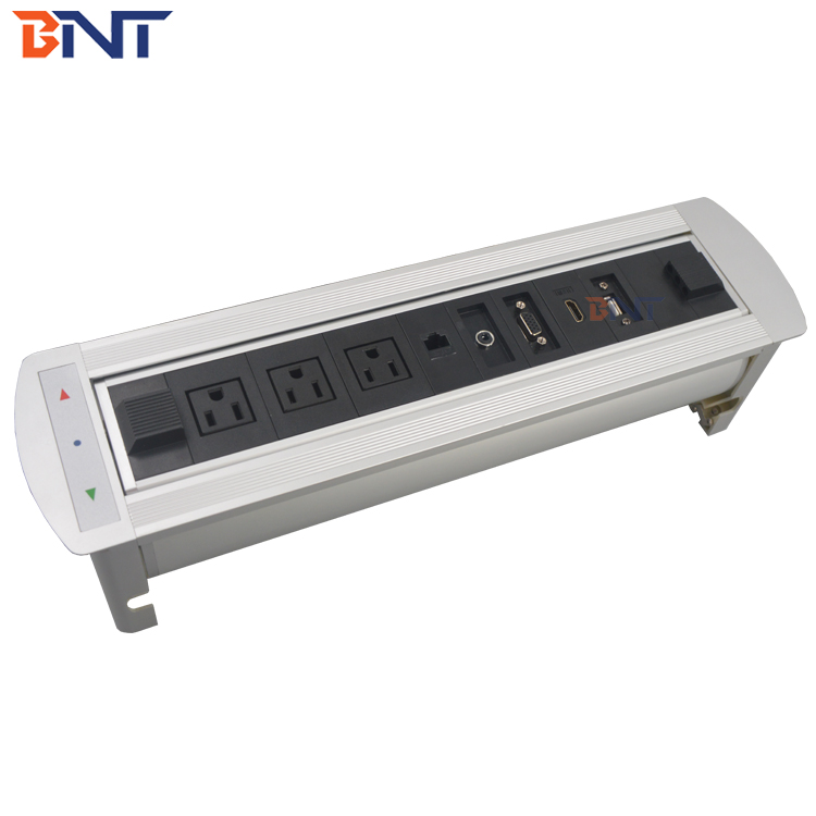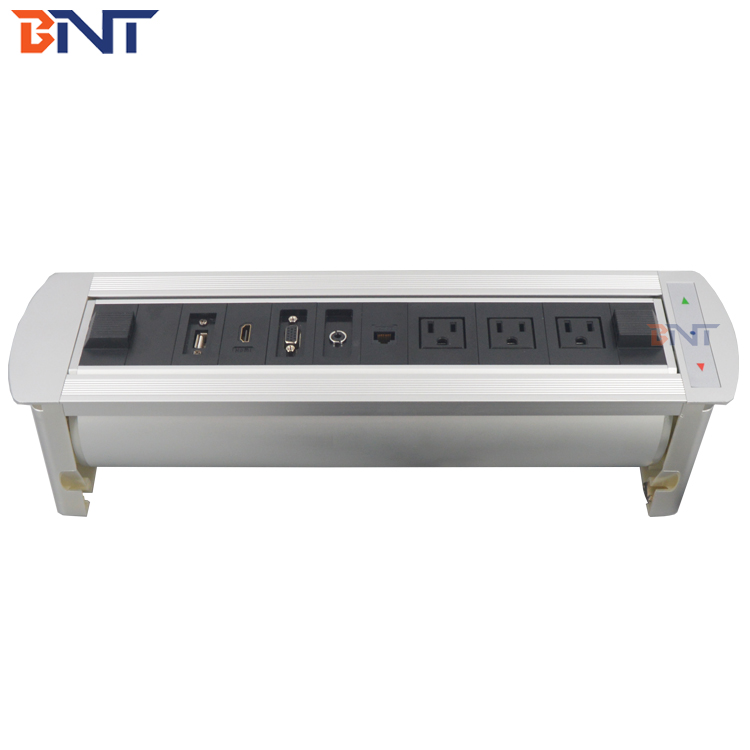 EK系列桌面插座设计为具有多功能配置的现代电动翻盖插座,它是办公家具中音频视频解决方案的隐藏设备。为时尚和现代环境提供服务。对于办公室和会议室,它可以通过触摸开关自动隐藏到桌子中。当使用插座时,只需触摸开关控制器,插座面板就会自动从表中旋转180度,然后将插座暴露在桌面上以备使用。当它不使用时,它会被180度的冷却关闭以与桌面齐平,通过控制关闭开关。它广泛用于高级办公桌,会议室桌面AV解决方案,酒店房间和培训室。