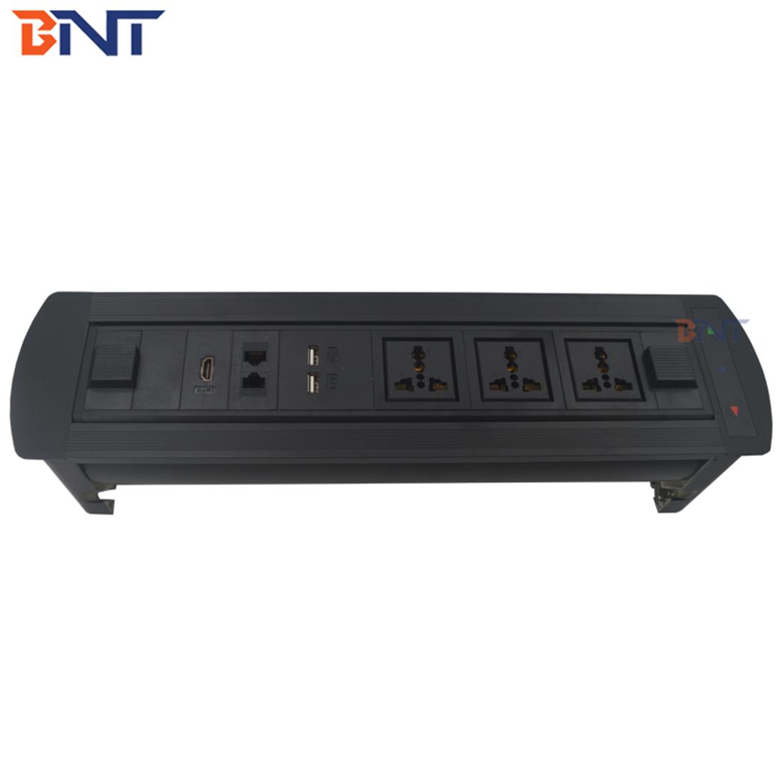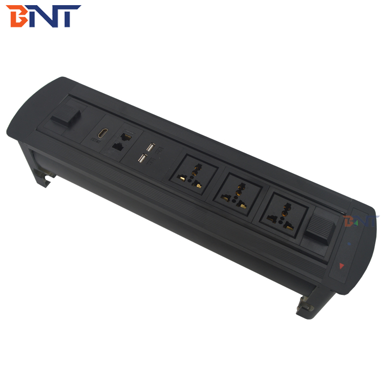 EK系列桌面插座设计为具有多功能配置的现代电动翻盖插座,它是办公家具中音频视频解决方案的隐藏设备。为时尚和现代环境提供服务。对于办公室和会议室,它可以通过触摸开关自动隐藏到桌子中。当使用插座时,只需触摸开关控制器,插座面板就会自动从表中旋转180度,然后将插座暴露在桌面上以备使用。当它不使用时,它会被180度的冷却关闭以与桌面齐平,通过控制关闭开关。它广泛用于高级办公桌,会议室桌面AV解决方案,酒店房间和培训室。