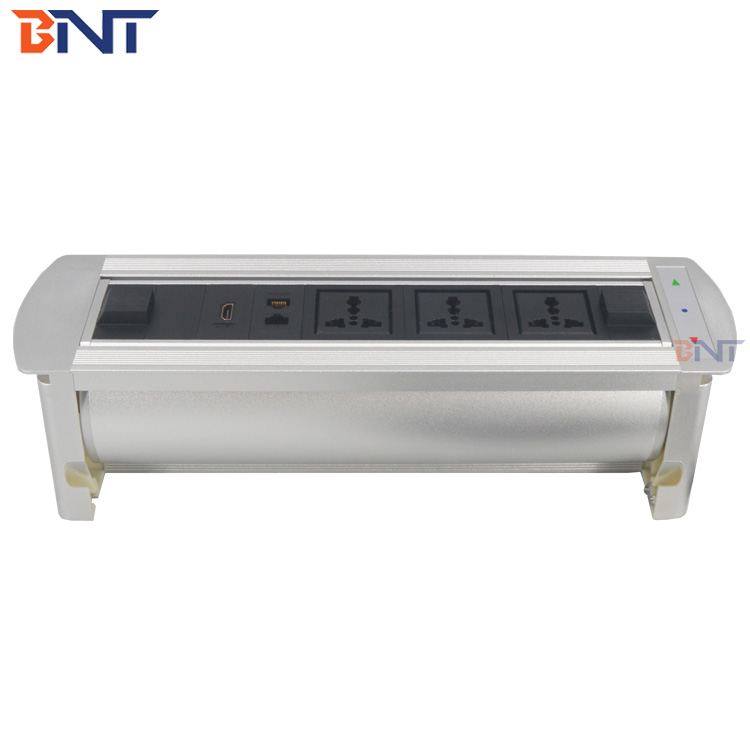 EK系列桌面插座设计为具有多功能配置的现代电动翻盖插座,它是办公家具中音频视频解决方案的隐藏设备。为时尚和现代环境提供服务。对于办公室和会议室,它可以通过触摸开关自动隐藏到桌子中。当使用插座时,只需触摸开关控制器,插座面板就会自动从表中旋转180度,然后将插座暴露在桌面上以备使用。当它不使用时,它会被180度的冷却关闭以与桌面齐平,通过控制关闭开关。它广泛用于高级办公桌,会议室桌面AV解决方案,酒店房间和培训室。