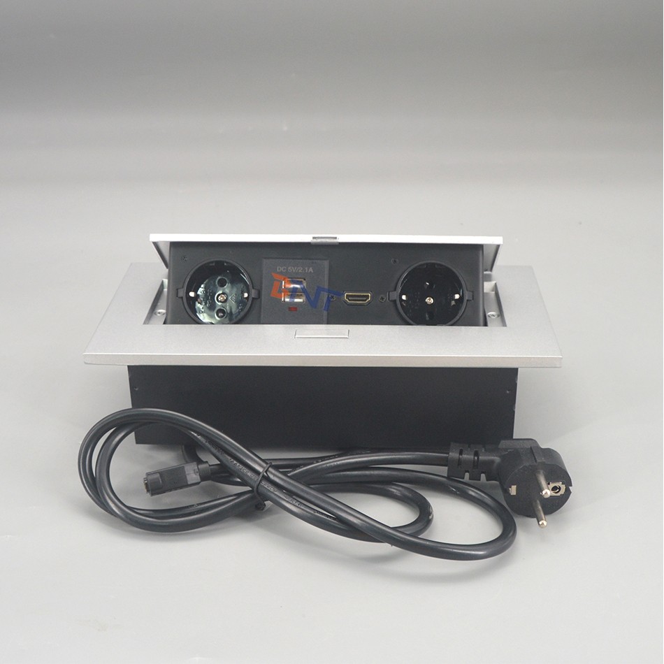 会议桌面隐藏式弹出式插座,一体式现代办公会议室多功能AV电源连接器解决方案。 该插座通常包含用于HDMI,VGA,音频和视频的办公室高质量投影音频视频连接功能。此外,它通常提供适用于各种不同电源插头的通用电源插座。