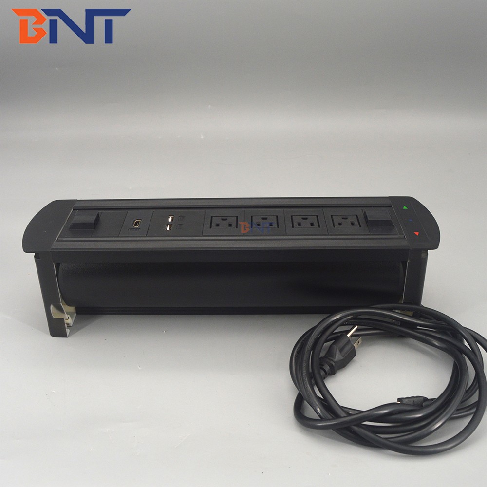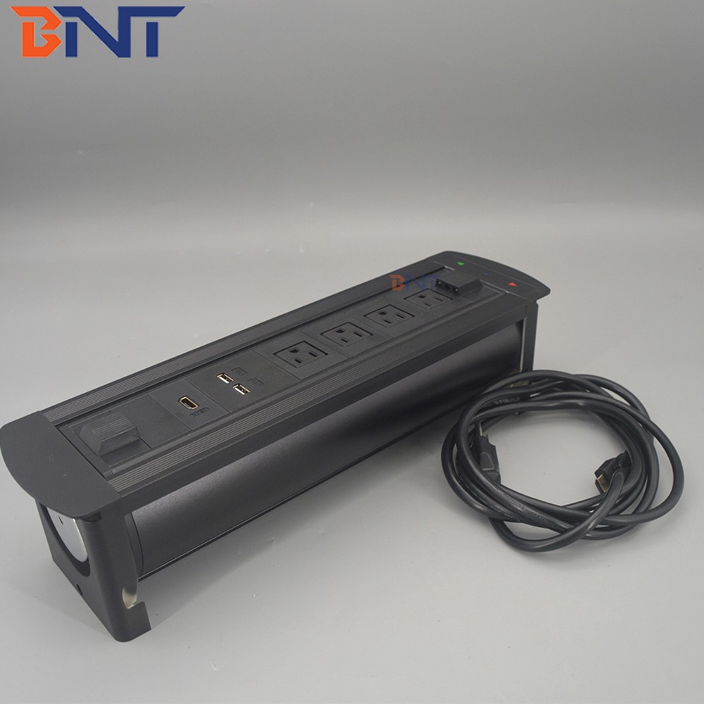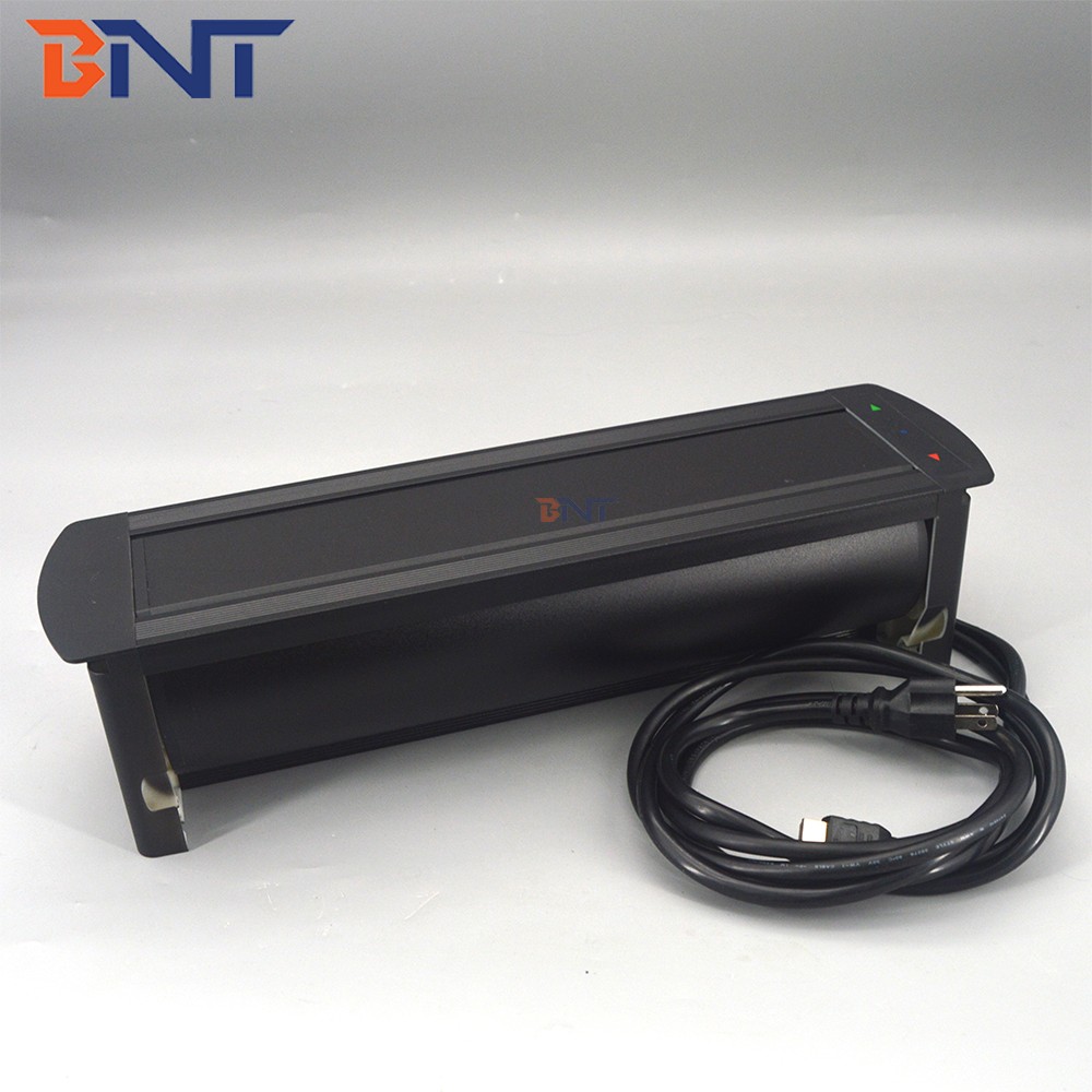 EK系列桌面插座设计为具有多功能配置的现代电动翻盖插座,它是办公家具中音频视频解决方案的隐藏设备。为时尚和现代环境提供服务。对于办公室和会议室,它可以通过触摸开关自动隐藏到桌子中。当使用插座时,只需触摸开关控制器,插座面板就会自动从表中旋转180度,然后将插座暴露在桌面上以备使用。当它不使用时,它会被180度的冷却关闭以与桌面齐平,通过控制关闭开关。它广泛用于高级办公桌,会议室桌面AV解决方案,酒店房间和培训室。