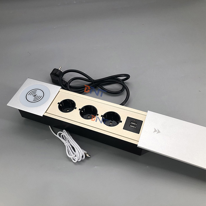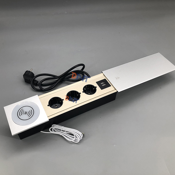 BC-01桌面插座设计为具有多功能配置的现代滑盖插座,它是一种隐藏的设备,因为它安装在桌面上使用并在不使用时隐藏在桌子中。使用无线充电器连接器,用户可以将手机放在充电器上,无需电线直接充电。根据您的选择,它还有USB充电器连接器,可通过USB线为移动设备或其他设备充电。