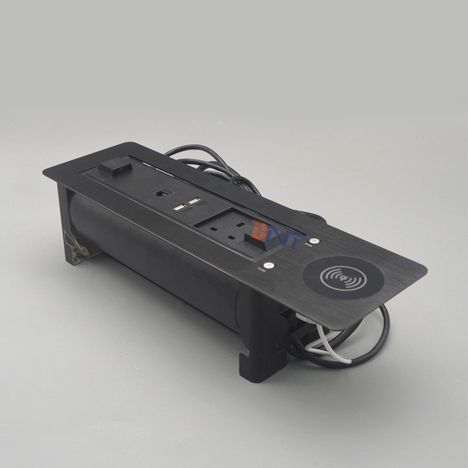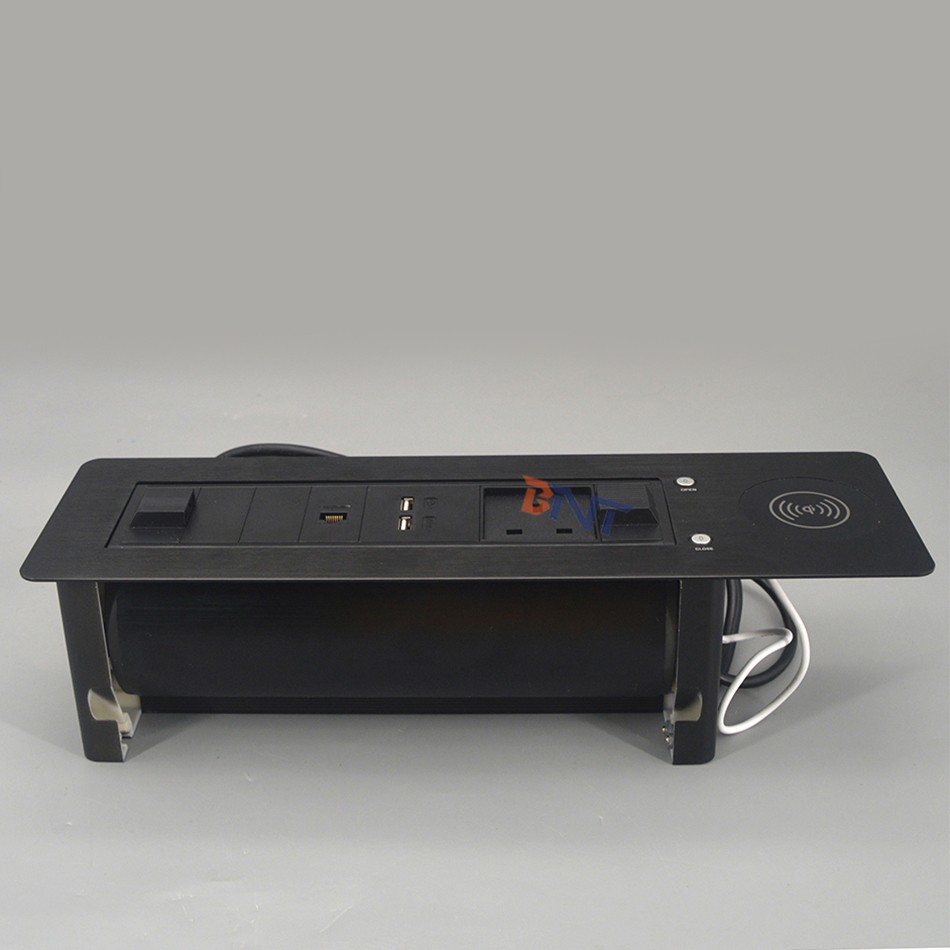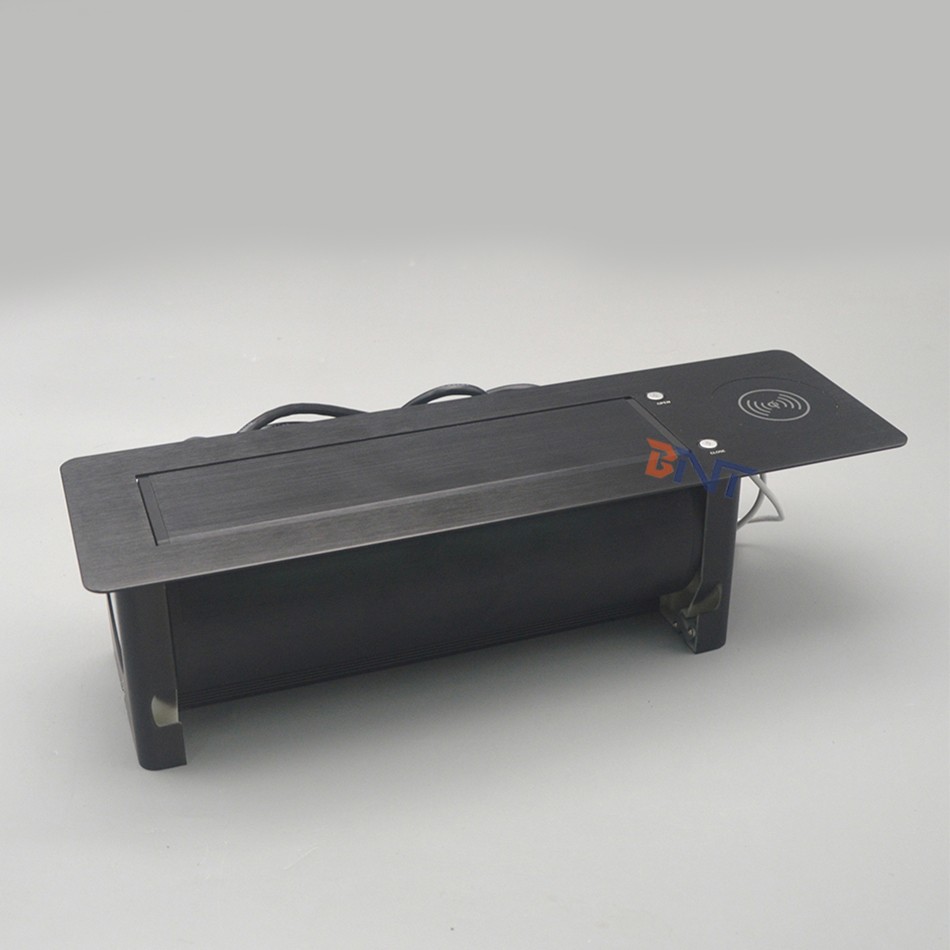 BC-01桌面插座设计为具有多功能配置的现代滑盖插座,它是一种隐藏的设备,因为它安装在桌面上使用并在不使用时隐藏在桌子中。使用无线充电器连接器,用户可以将手机放在充电器上,无需电线直接充电。根据您的选择,它还有USB充电器连接器,可通过USB线为移动设备或其他设备充电。