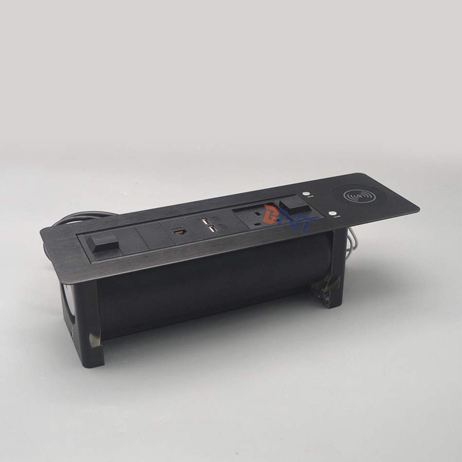1,电动桌面插座提供电源,互联网,电话,VGA,HDMI,3.5音频,USB,MIC接入的插座,可以为其他数据和AV接口定制。