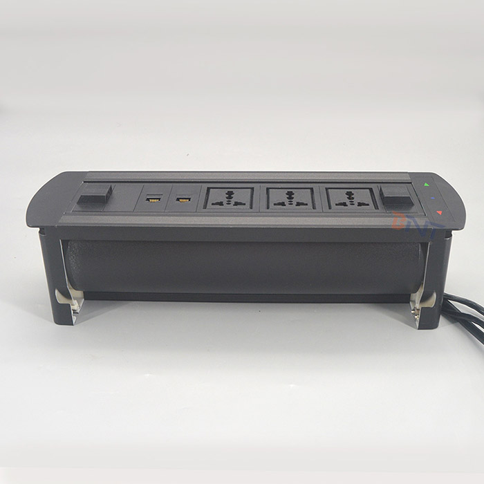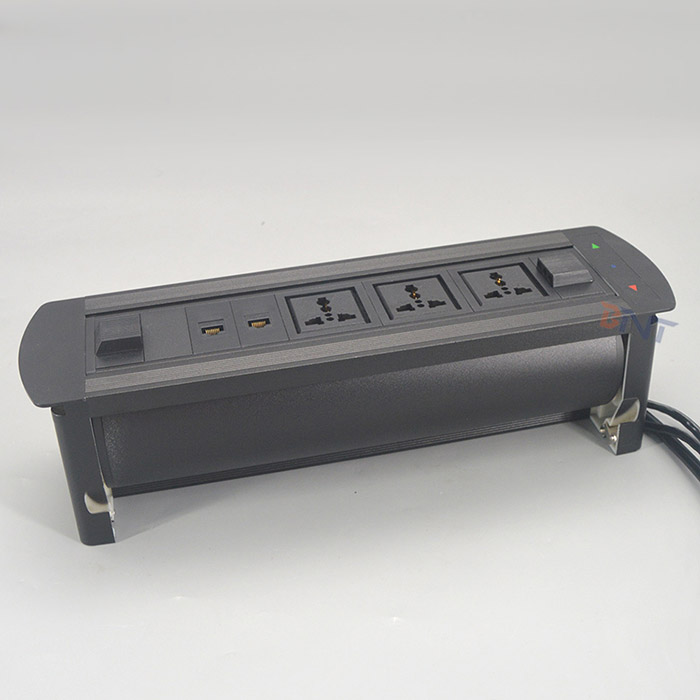 EK系列桌面插座设计为具有多功能配置的现代电动翻盖插座,它是办公家具中音频视频解决方案的隐藏设备。为时尚和现代环境提供服务。对于办公室和会议室,它可以通过触摸开关自动隐藏到桌子中。当使用插座时,只需触摸开关控制器,插座面板就会自动从表中旋转180度,然后将插座暴露在桌面上以备使用。当它不使用时,它会被180度的冷却关闭以与桌面齐平,通过控制关闭开关。它广泛用于高级办公桌,会议室桌面AV解决方案,酒店房间和培训室。