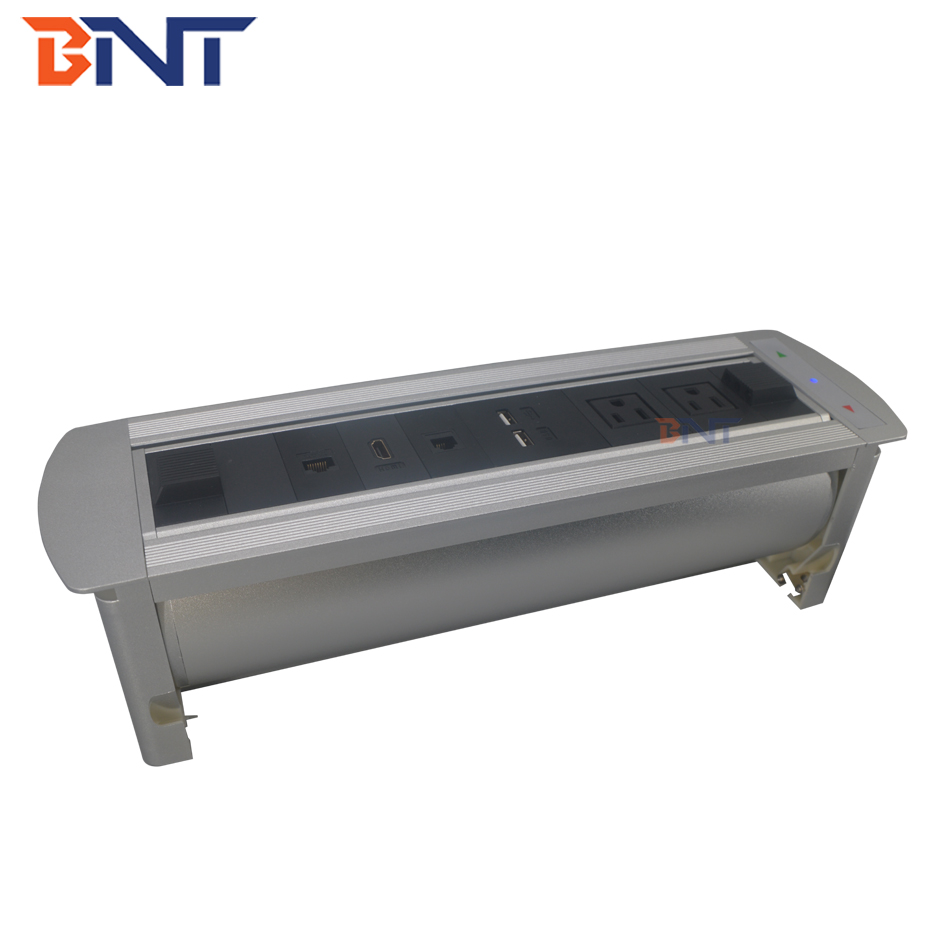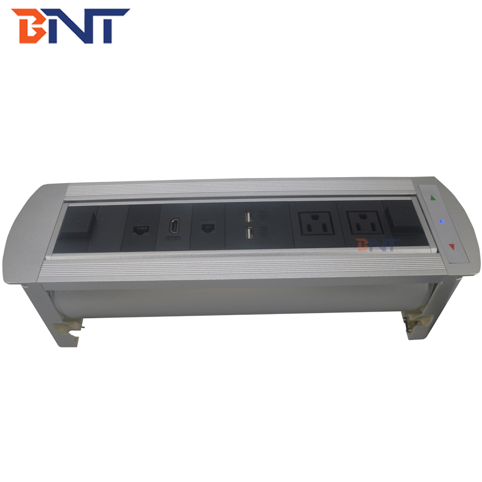 1,电动桌面插座提供电源,互联网,电话,VGA,HDMI,3.5音频,USB,MIC接入的插座,可以为其他数据和AV接口定制。