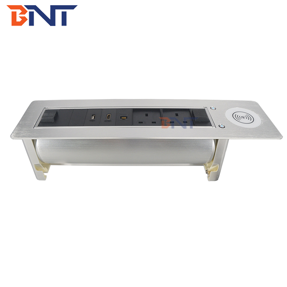 BC-01桌面插座设计为具有多功能配置的现代滑盖插座,它是一种隐藏的设备,因为它安装在桌面上使用并在不使用时隐藏在桌子中。使用无线充电器连接器,用户可以将手机放在充电器上,无需电线直接充电。根据您的选择,它还有USB充电器连接器,可通过USB线为移动设备或其他设备充电。