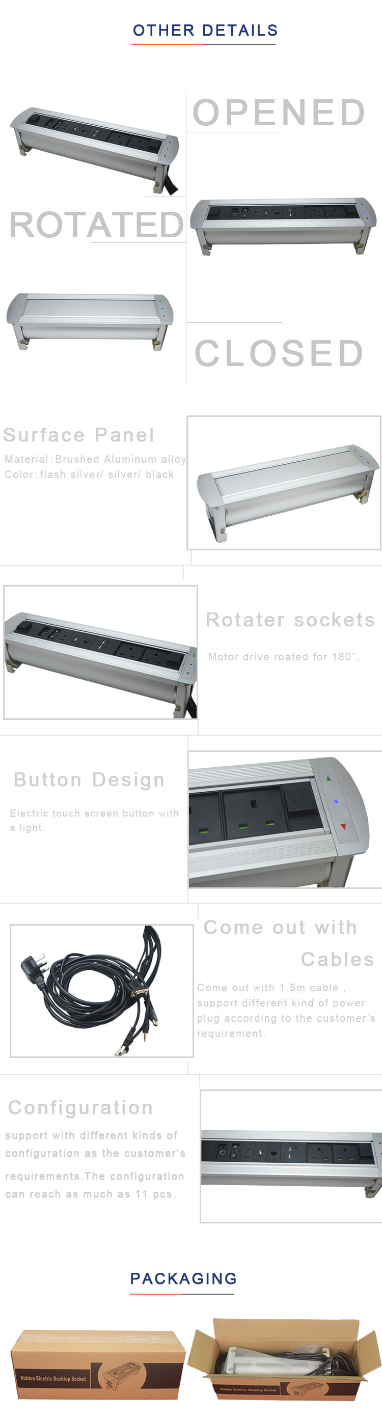 EK系列桌面插座设计为具有多功能配置的现代电动翻盖插座,它是办公家具中音频视频解决方案的隐藏设备。为时尚和现代环境提供服务。对于办公室和会议室,它可以通过触摸开关自动隐藏到桌子中。当使用插座时,只需触摸开关控制器,插座面板就会自动从表中旋转180度,然后将插座暴露在桌面上以备使用。当它不使用时,它会被180度的冷却关闭以与桌面齐平,通过控制关闭开关。它广泛用于高级办公桌,会议室桌面AV解决方案,酒店房间和培训室。