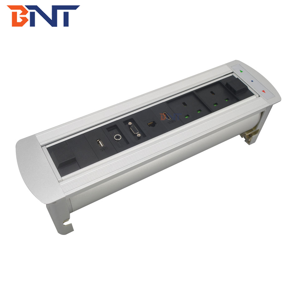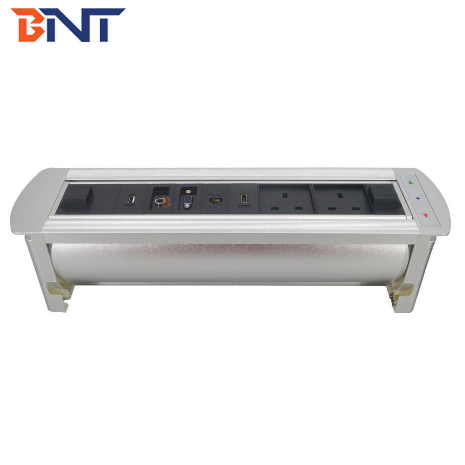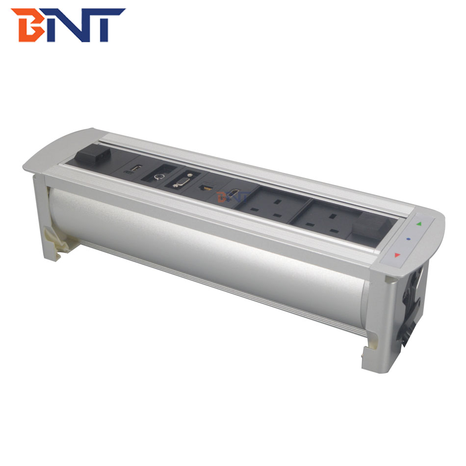 EK系列桌面插座设计为具有多功能配置的现代电动翻盖插座,它是办公家具中音频视频解决方案的隐藏设备。为时尚和现代环境提供服务。对于办公室和会议室,它可以通过触摸开关自动隐藏到桌子中。当使用插座时,只需触摸开关控制器,插座面板就会自动从表中旋转180度,然后将插座暴露在桌面上以备使用。当它不使用时,它会被180度的冷却关闭以与桌面齐平,通过控制关闭开关。它广泛用于高级办公桌,会议室桌面AV解决方案,酒店房间和培训室。