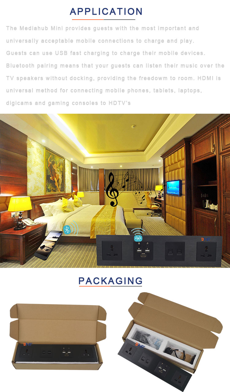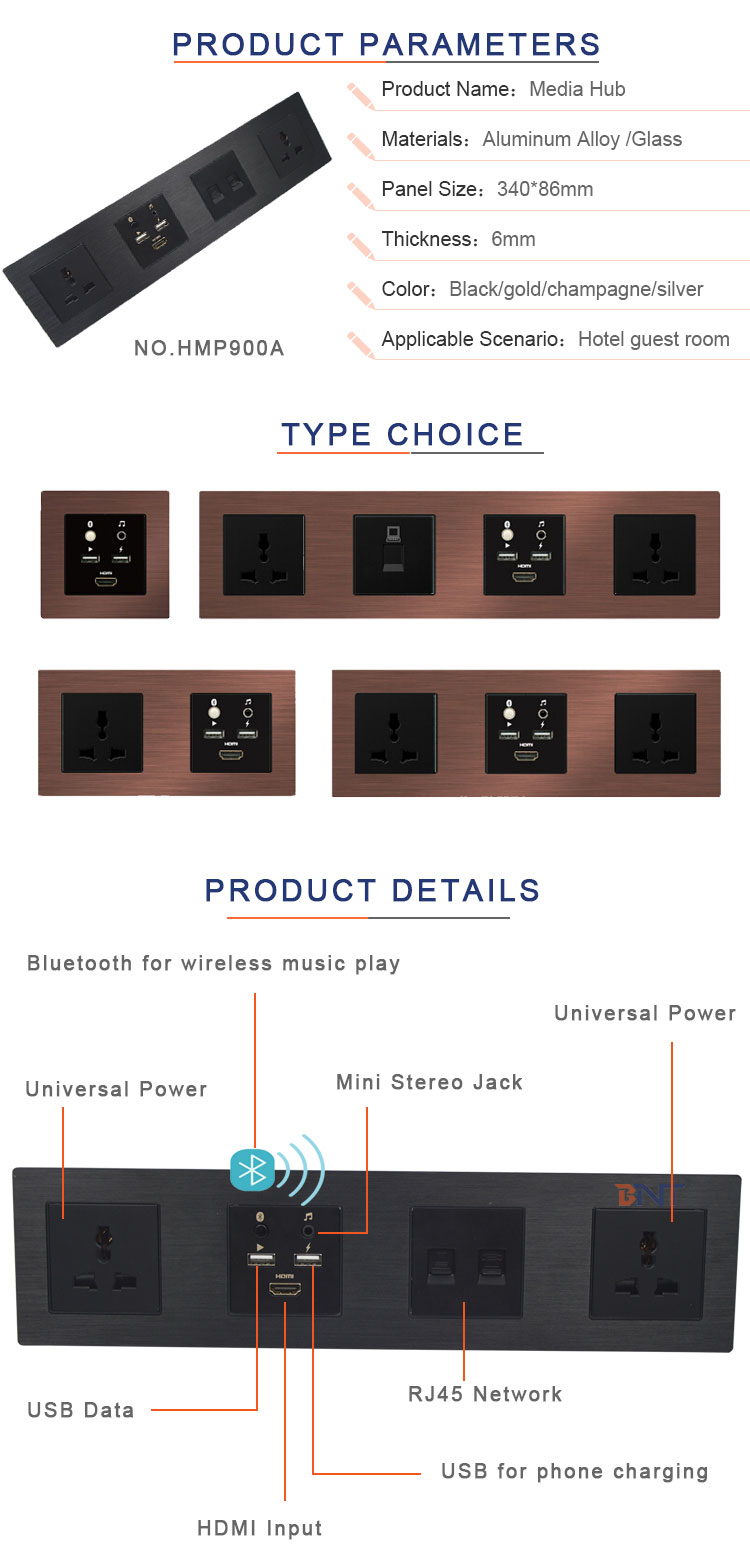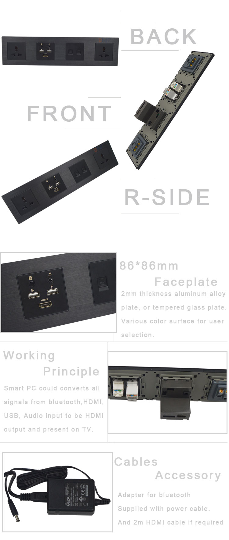 铝合金墙壁插座板广泛用于办公和酒店家具,高级办公室,豪华会议桌,酒店和多媒体教室和培训室。