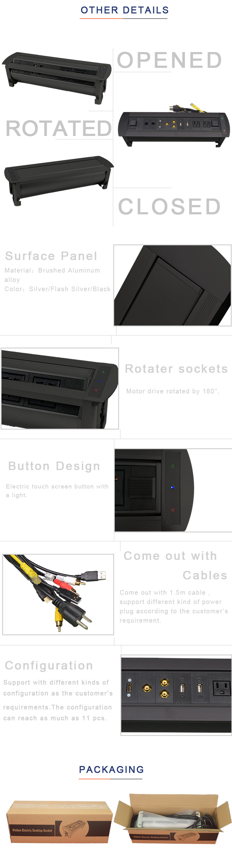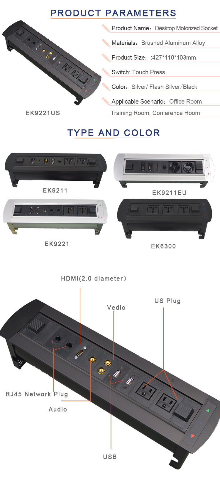 EK系列桌面插座设计为具有多功能配置的现代电动翻盖插座,它是办公家具中音频视频解决方案的隐藏设备。为时尚和现代环境提供服务。对于办公室和会议室,它可以通过触摸开关自动隐藏到桌子中。当使用插座时,只需触摸开关控制器,插座面板就会自动从表中旋转180度,然后将插座暴露在桌面上以备使用。当它不使用时,它会被180度的冷却关闭以与桌面齐平,通过控制关闭开关。它广泛用于高级办公桌,会议室桌面AV解决方案,酒店房间和培训室。