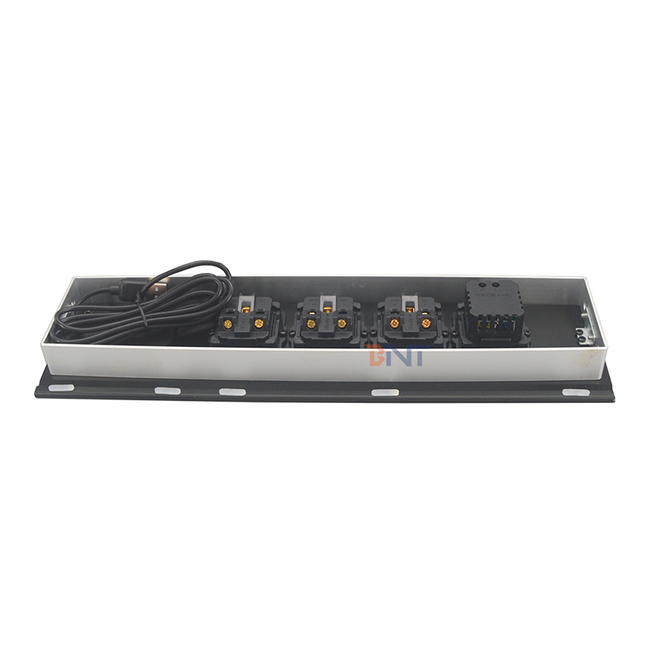 BC-0405桌面插座设计为具有多功能配置的现代滑盖插座,它是一种隐藏的设备,因为它安装在桌面上使用并在不使用时隐藏在桌子中。有USB充电器连接器,可通过USB线为移动设备或其他设备充电。