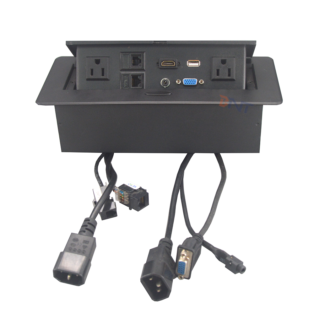 会议桌面隐藏式弹出式插座,一体式现代办公会议室多功能AV电源连接器解决方案。 该插座通常包含用于HDMI,VGA,音频和视频的办公室高质量投影音频视频连接功能。此外,它通常提供适用于各种不同电源插头的通用电源插座。