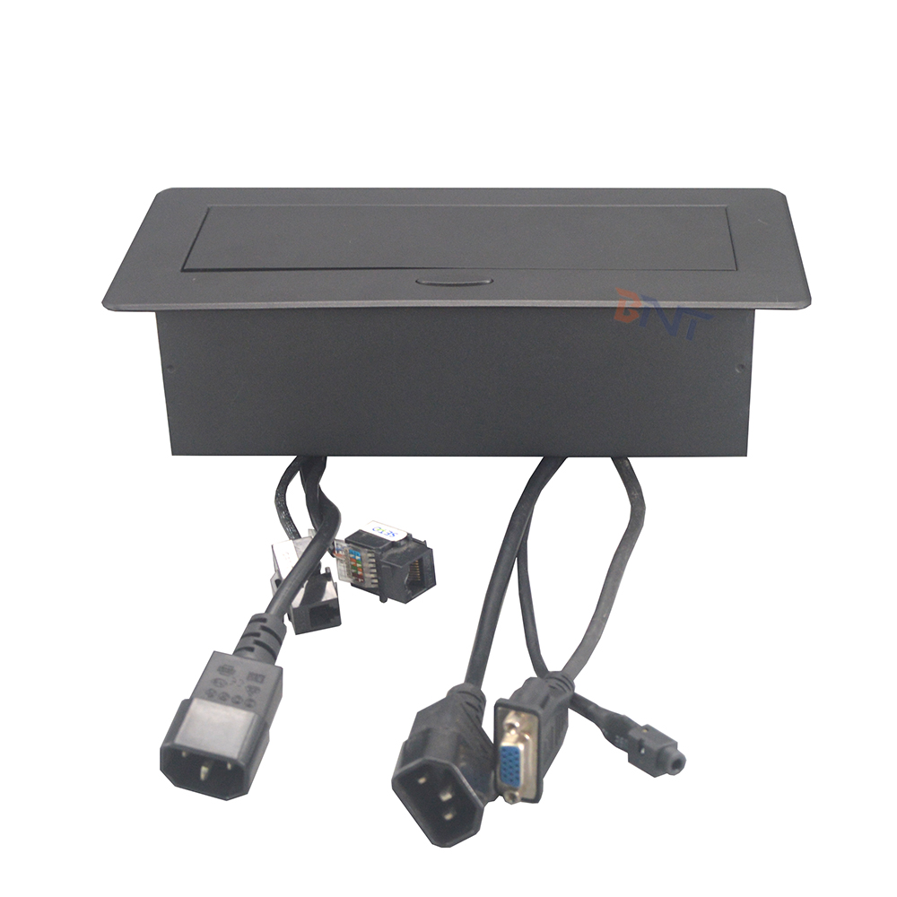 这个插座通常安装在工作台和所有连接器上并隐藏在表面锌合金面板下面。 可以节省更多空间并保持表格整合和符合要求。 为办公室和会议室提供时尚和现代化的环境。