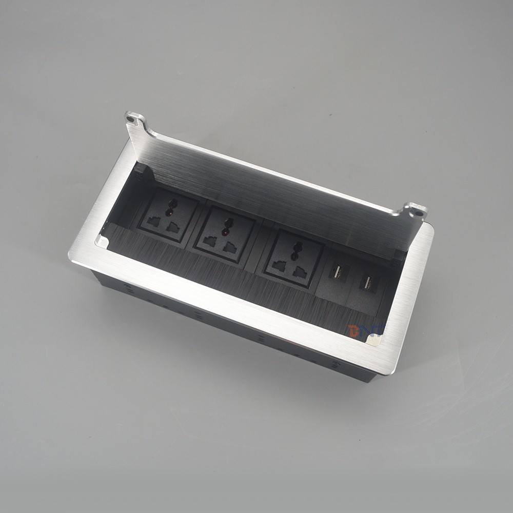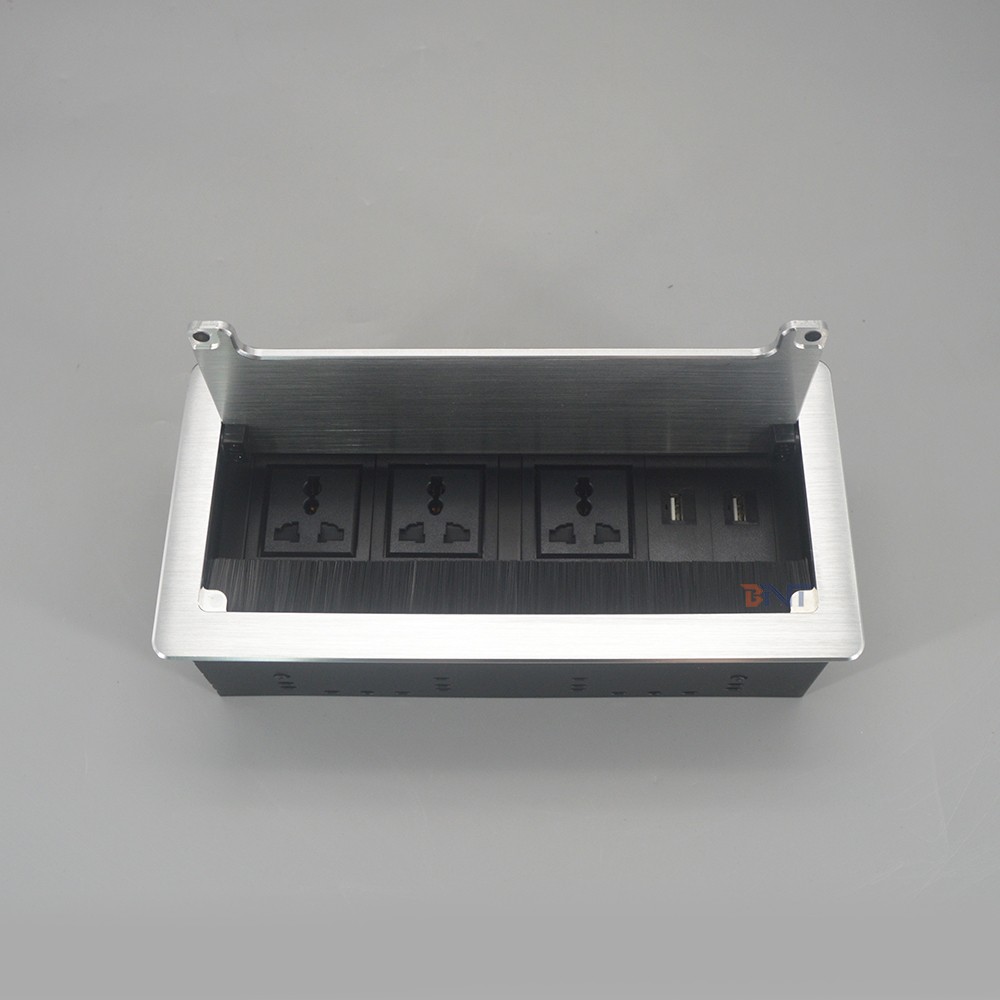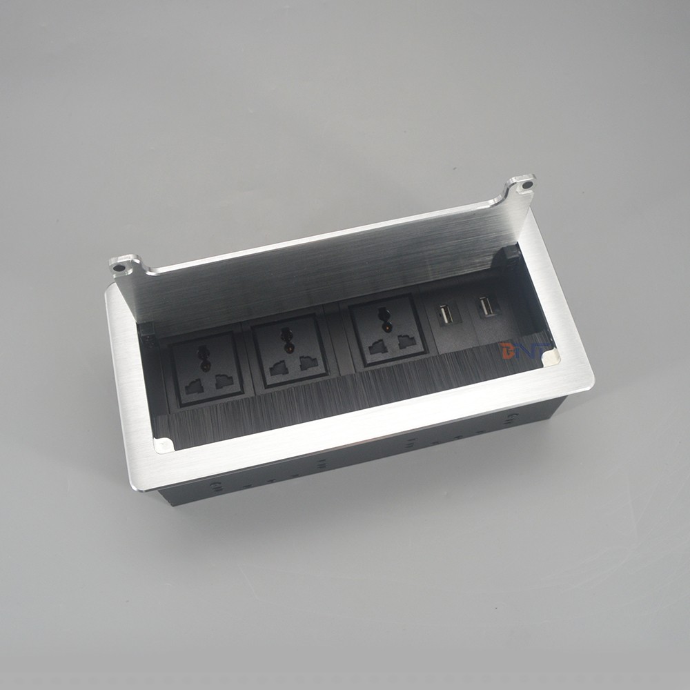 桌面插座的拉丝盖由铝合金材质加工制成,可以打开和翻盖关闭。