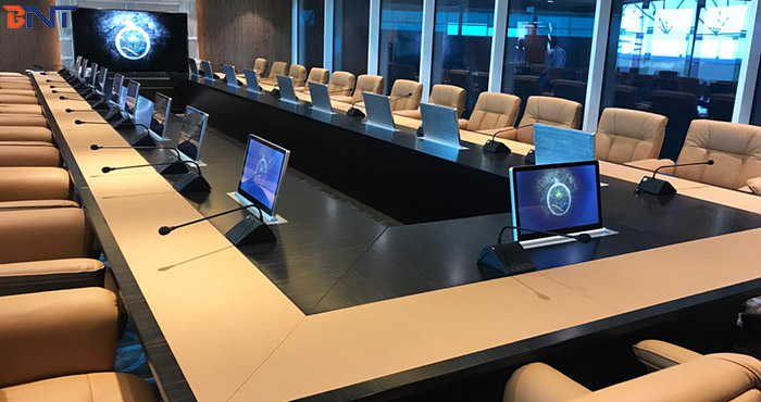 14 Units flip up monitors in an modern conference room in Kazakhstan flip up monitor, conference system, Guangzhou Boente Technology Co Ltd, desktop computer